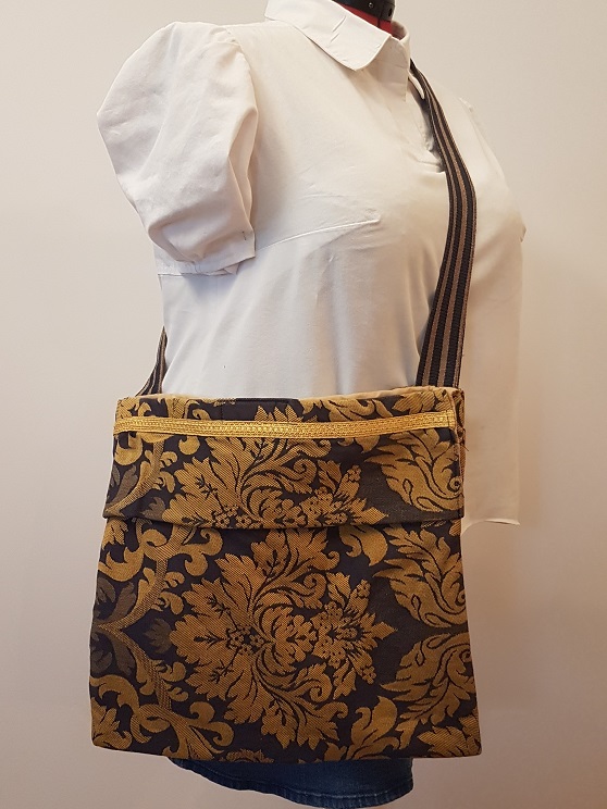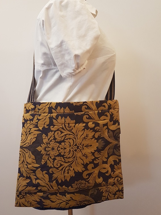 Sac doublé à bandoulière, avec une grande ouverture de type sac d’achat et des poches de chaque côté. La bandoulière n’est pas ajustable.